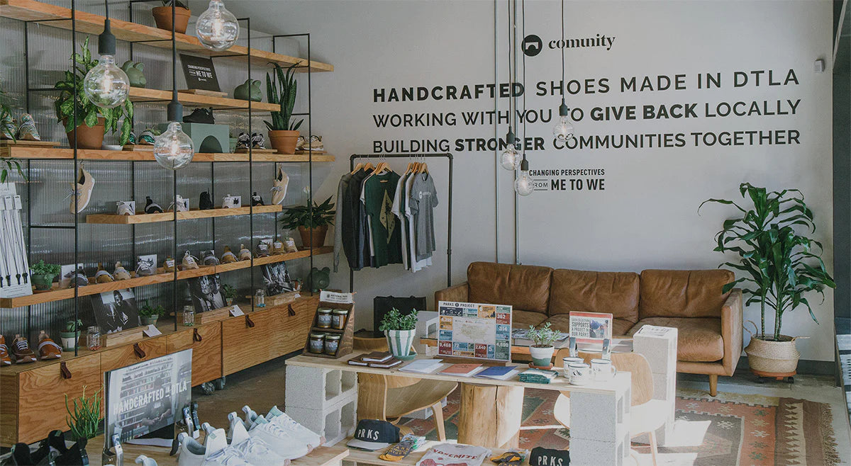 Our space at 584 Mateo Street serves as COMUNITYmade headquarters, as well as our showroom and boutique manufacturing facility. Our space is designed as a spot for you to hang out, meet new friends and talk about ways to get involved in our community. Our “front living room” is the showcase for our Handcrafted in DTLA shoes that you can try on and purchase on site. It is also a place to come and sip your coffee, cozy up, recharge and network. A big shout out to Pepper and Salt Design for their amazing talent and vision that brought our dream to life.